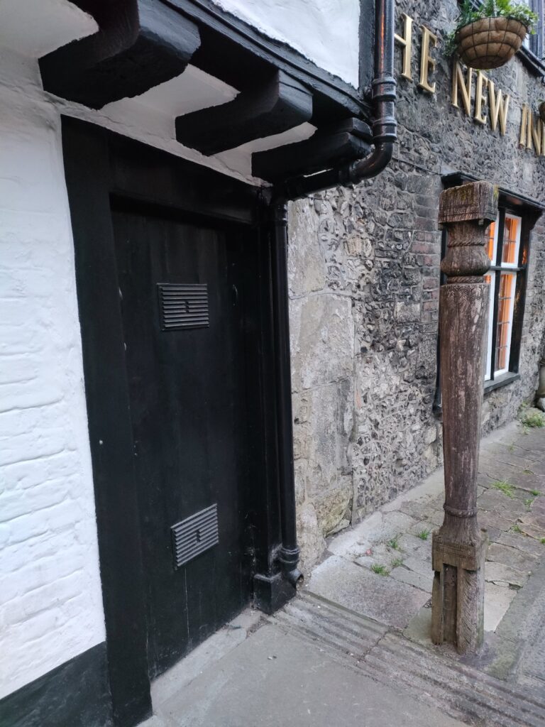 “My grandfather, Charles Scammell, was an antique dealer at the Olde House next to the inn – he moved there in 1928 from his shop in the High Street. At that time there were, outside the house, metal capped posts of the same shape and design of those that used to be on the kerb of Exeter Street prior to WW2. There were no chains, but bars connected these posts. When metal was needed during the war these posts and bars were taken and my grandfather put in posts to mark his boundary. He put in three – one on the boundary of the passageway with the New Inn, of which the landlord was Mr Jim Kerley, and two on the other side of his front door. The Olde House was once two properties, Nos. 47 and 49. The two posts were placed in front of No. 49 and grandfather had roofing felt over them, forming a kind of canopy.”